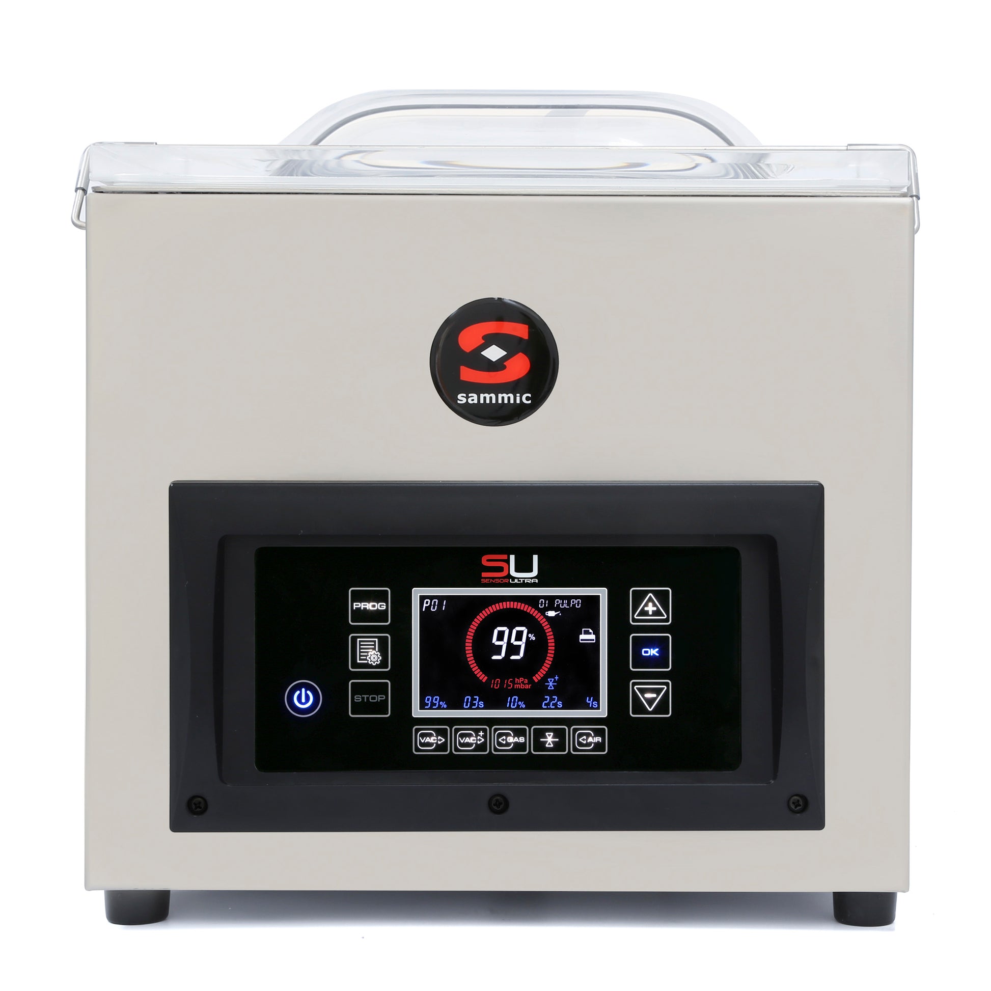 Equipped with a high quality Busch pump, Dry Oil program: to remove impurities and clean the oil in the pump for optimal working conditions, Controlled decompression preventing damage to the product or the bag, Cable free sealing bar with 2 elements for an effective double seal, STOP button to move on to the next stage of the cycle at any time, Hour counter to monitor working hours and time until next service, Pause button enables the freezing of the vacuum stage at any point to accelerate marination/curing and tenderising, Staged vacuum program for soft and porous products allowing the removal of air trapped in products that would otherwise not be extracted, 25 program memory and locking function to eliminate inadvertent changing of programming, H_O Sensor to significantly reduce spillage inside chamber, Optional: label printing system