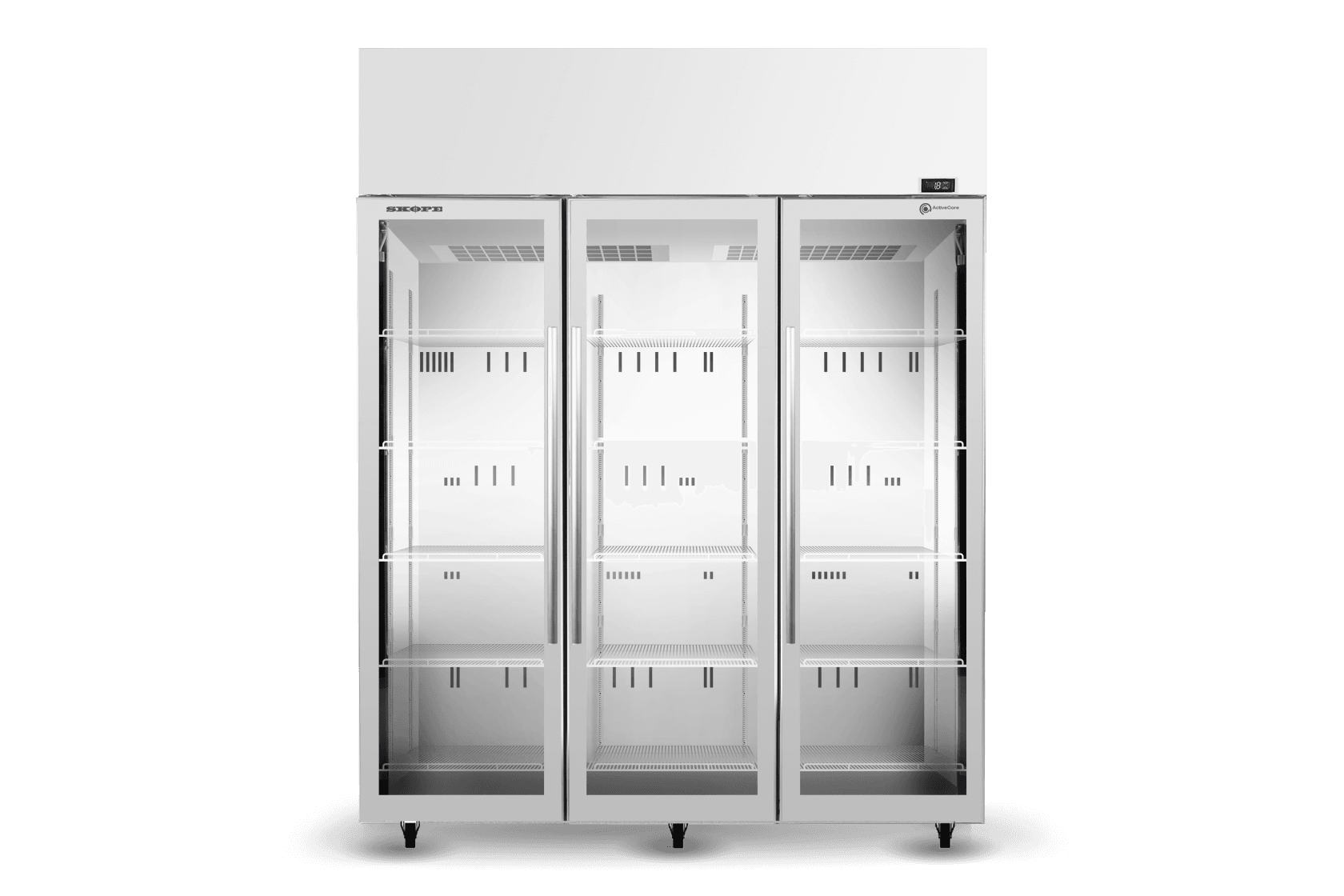 ActiveCore 2: durability, power economy, and app-based controlÊin aÊdouble glass door commercial display fridge. Top mounted lightbox for custom graphics and 897 litres of space.