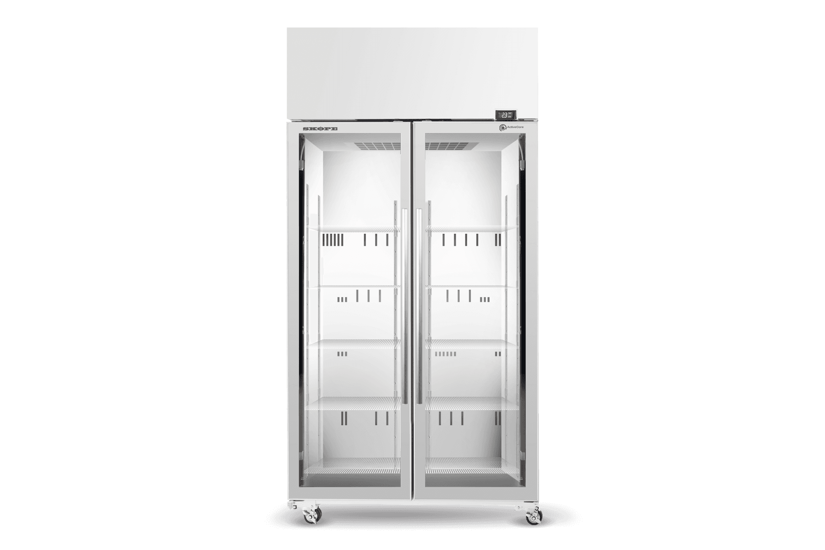ActiveCore 2: durability, power economy, and app-based control in a single glass door commercial display fridge. Top mounted lightbox for custom graphics and 558 litres of space.
